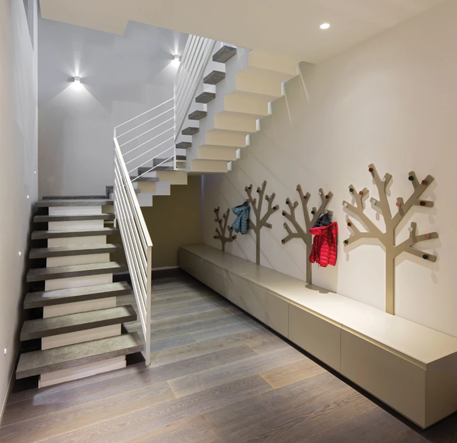 "פינת סדר" בפתח חלל המרתף המשמש כמרחב משחקים לילדים: מתלים מעוצבים כענפי עצים ויחידת מגירות נמוכה מאפשרים לכל ילד לתלות את מעילו ולאחסן את חפציהם במגירות אישיות הנושאות את שמותיהם.