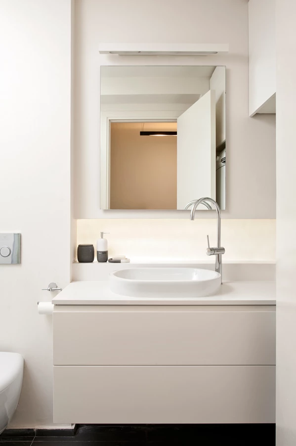 החומרים העיקריים שומרים על מראה נקי והמשכי. ריצוף חדר הרחצה ממשיך גם במסדרון עד לקו של תחילת החלל המרכזי. המשך הריצוף בפרקט בחדרי השינה ובמטבח מסייע אף הוא לחזק את הרצף החללי. הבחירה במטבח בצבע לבן שמטמיע בו את המקרר, מכונת הכביסה ושאר המערכות, מייצרת המשך לקיר הלבן ומחזקת את תחושת המרחב.