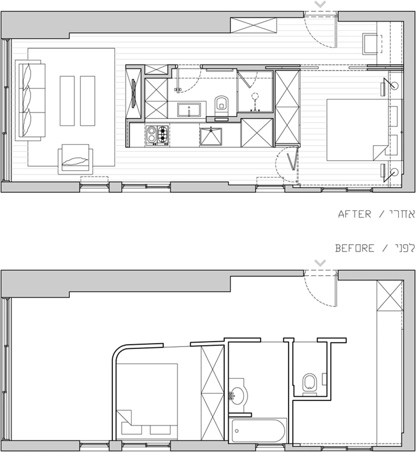 הדיירת המתגוררת בדירה נטשה את חלומה לעבור לדירה מרווחת יותר בעקבות מחירי הדירות המאמירים בתל-אביב ופנתה למשרד לבחון אפשרות תכנון מחדש של הדירה. היא בקשה ליצור בדירה תחושת מרחב מקסימאלית, תוך חלוקה ברורה ל-2 חדרים (מגורים ושינה), כמו גם מקומות אחסון רבים, מטבח בגודל מלא ופינת עבודה.