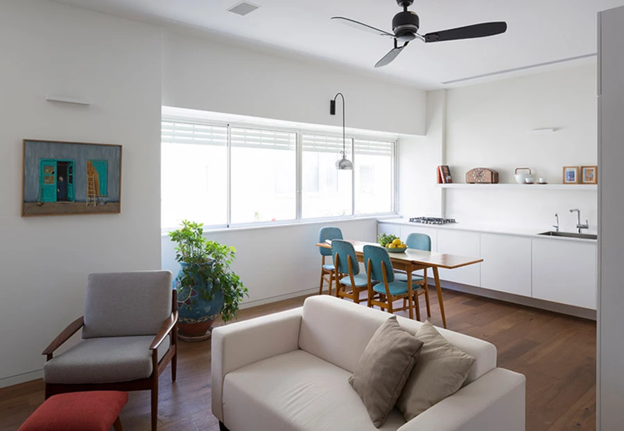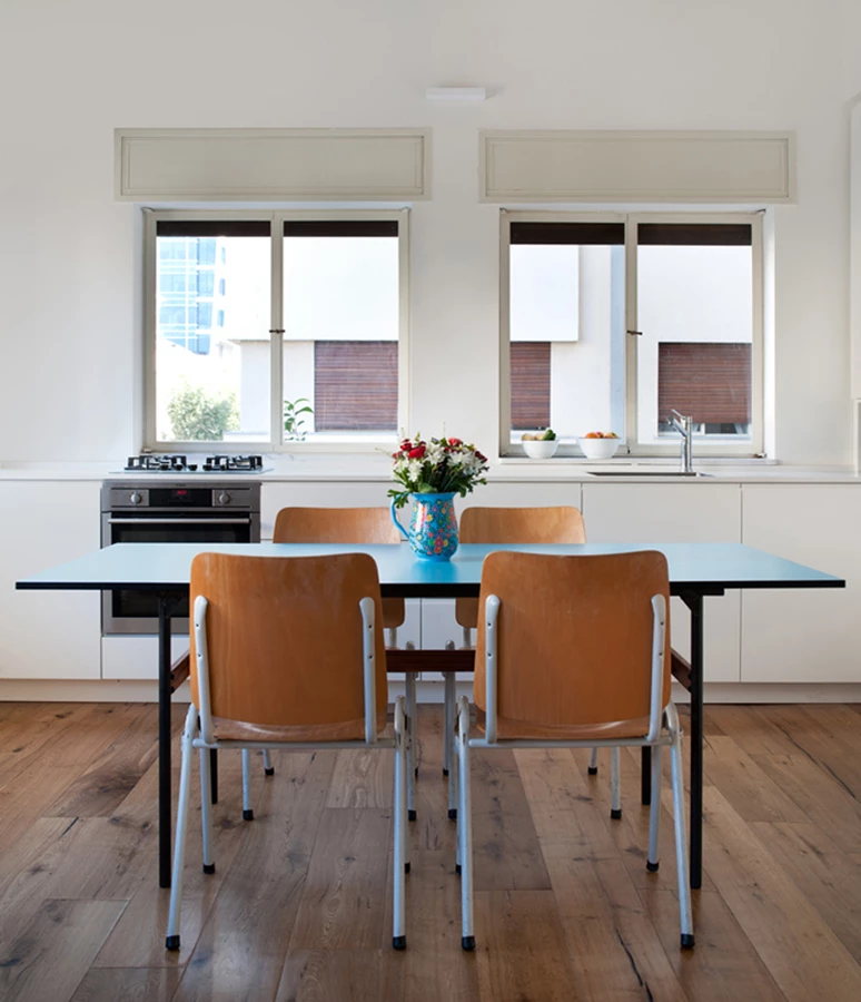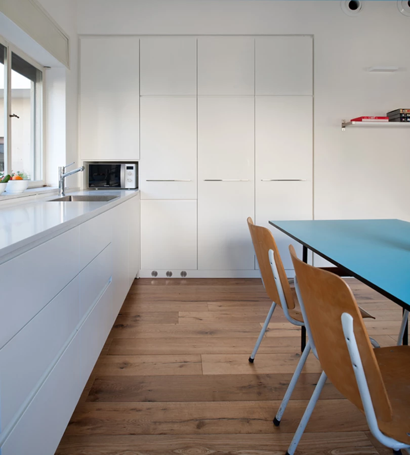 תחושת המרחב בדירה מתאפשרת בזכות כניסה של אור, אוויר טבעי ותנועה ואודות לשימוש הרצוף בחומרים ( כמו למשל הבחירה להמשיך את הפרקט במטבח). ארונות המטבח תוכננו בצבע לבן כהמשך טבעי לקירות, ללא ידיות חיצוניות, כשהריהוט של בעלת הדירה משתלב עם הקו הכללי.