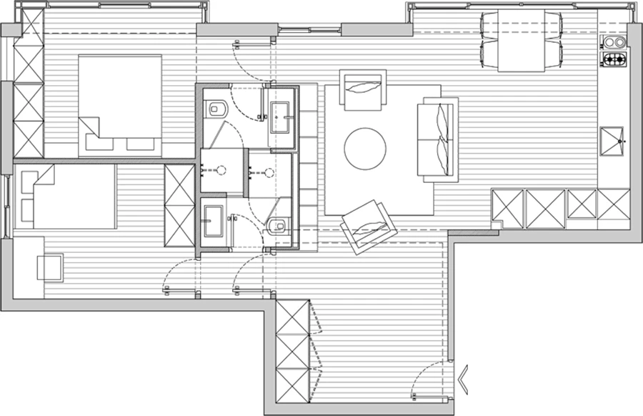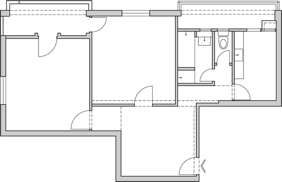 על- ידי העברת חדר הרחצה אל עומק הדירה (פתרון של ווטנה לאוורור, בדומה לאופן בו נוהגים בבתי מלון) השתחרר שטח רצפה לטובת המטבח, והסלון המוארך התקצר לטובת חדר שינה נוסף שמופרד על - ידי דלת הזזה גבוהה, המקשרת בין שני החללים בתנועה, מבט ושמירה על הרצף היזואלי של סדרת החלונות.