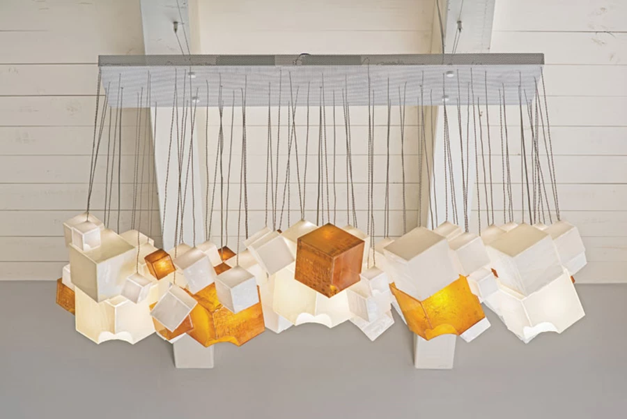 חדרו של הבן הקטן: גוף תאורה עליז מעוצב כמקבץ קונכיות צבעוניות.