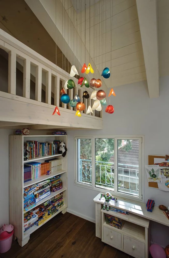את חדרי הילדים מעטרים גופים שהוזמנו על ידיהם, כמו, למשל, מקבץ עליז של קונכיות צבעוניות שנתלה בחדרו של הבן הצעיר.