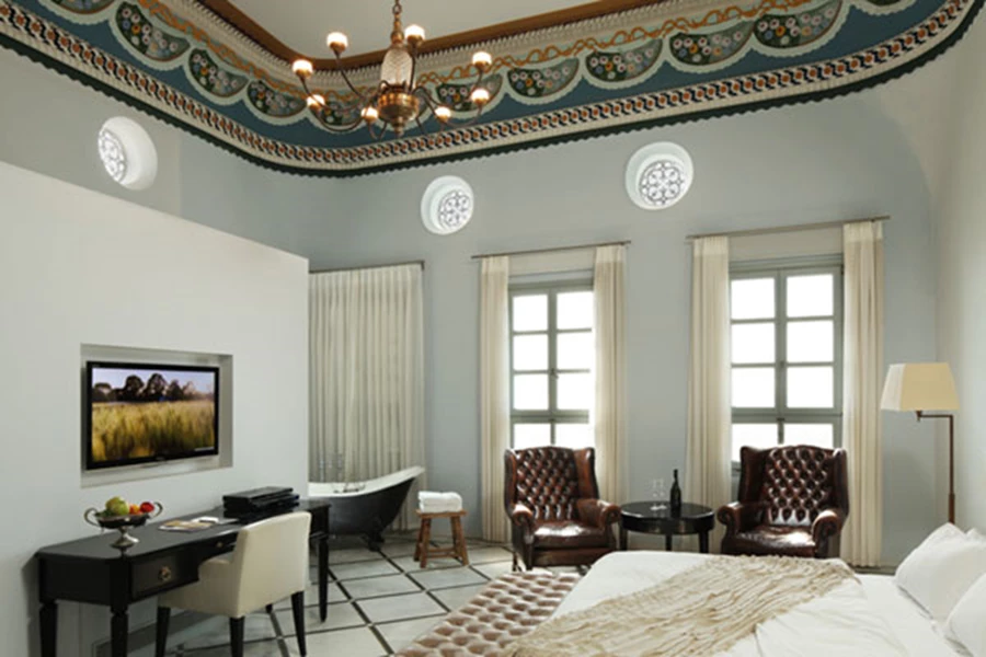 העיצוב נשען בעיקר על מינימליזם טהור, הקירות נטולי תמונות כדי שלא להוריד מעצמת האותנטיות של המקום, הלובי מאופיין בספות רביצה נוחות, שנדלירים מרשימים ובכיסאות סורים עתיקים שמשלימים את הטיול בכמוסת הזמן. שחזור המבנה מקיף כל פרט שבו החל מהרצפה המקורית, דרך עמודי השיש המרשימים וכלה בחלונות המבנה הגדולים שמעניקים נוף פנורמי לכיוון סמטאות יפו העתיקה ונמל יפו.