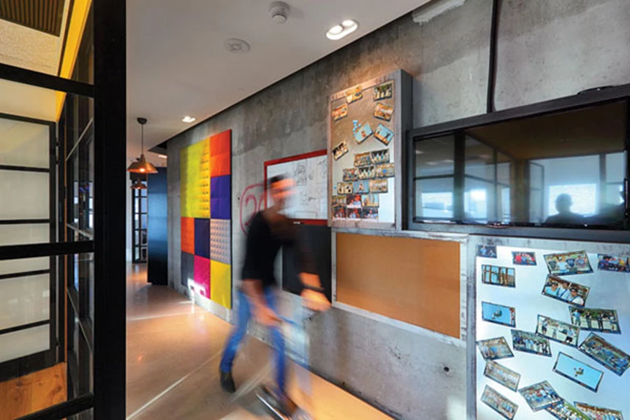 "סיבוב ברחוב" מזמן ויזואליה משתנה על הקירות: פנלים אקוסטיים צבעוניים, חיפוי סרגלי עץ, ובמה לביטוי אישי של העובדים – לוח מחיק לשרבוט, משטח לתליית תמונות אישיותף ומסך להקרנת תוכן אישי של החברה.