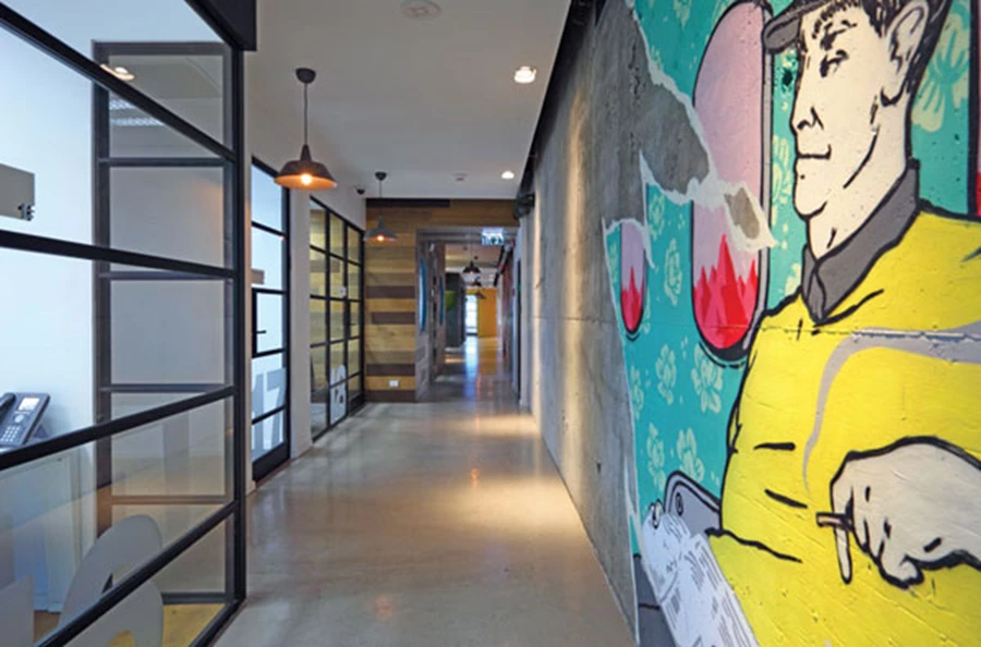 משחק נפחים מייצר ממד משתנה וקירות הבטון החשוף מהם הוסרו מחיצות הגבס מהווים קנבס לחגיגה יצירתית. "תא טלפון" עשוי לבד כאלמנט פונקציונאלי ונקודת מיקוד צבעונית כאחד, וציור הגרפיטי המבוסס על עולם התוכן של החברה "מטפס" בשם האותנטיות על הצנרת העליונה. הציור בוצע ללא שום שבלונות ע"י אמני קבוצת "ברוקן פינגאז"