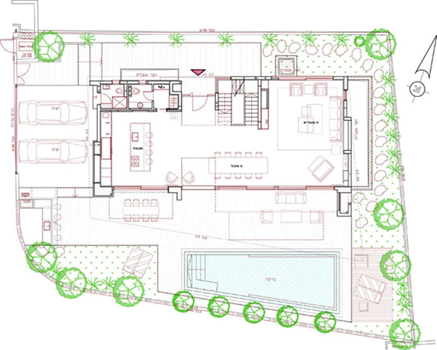 פרגולה המשלבת מסגרת אלומיניום ומילואת עץ, ופינות ישיבה ואוכל שהוצבו בחפיפה לפונקציות הפנים מייצרות נגישות נוחה ומידית בין שני המרחבים. בריכה: 'אקוופולקו', ריהוט גן: 'גנים ושושנים'.