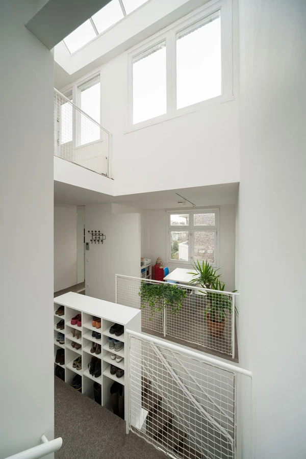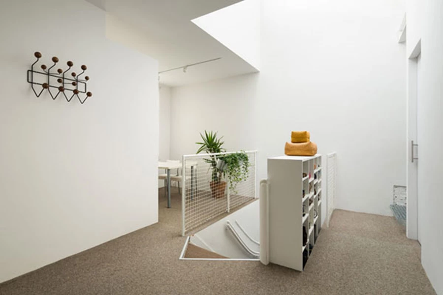 מופע החלל: בהיר, פתוח ומאופיין בממד אנכי. עציצים ירוקים על סורגי מעקה המדרגות יוצקים תוכן של חיות טבעית למארג הלבן.