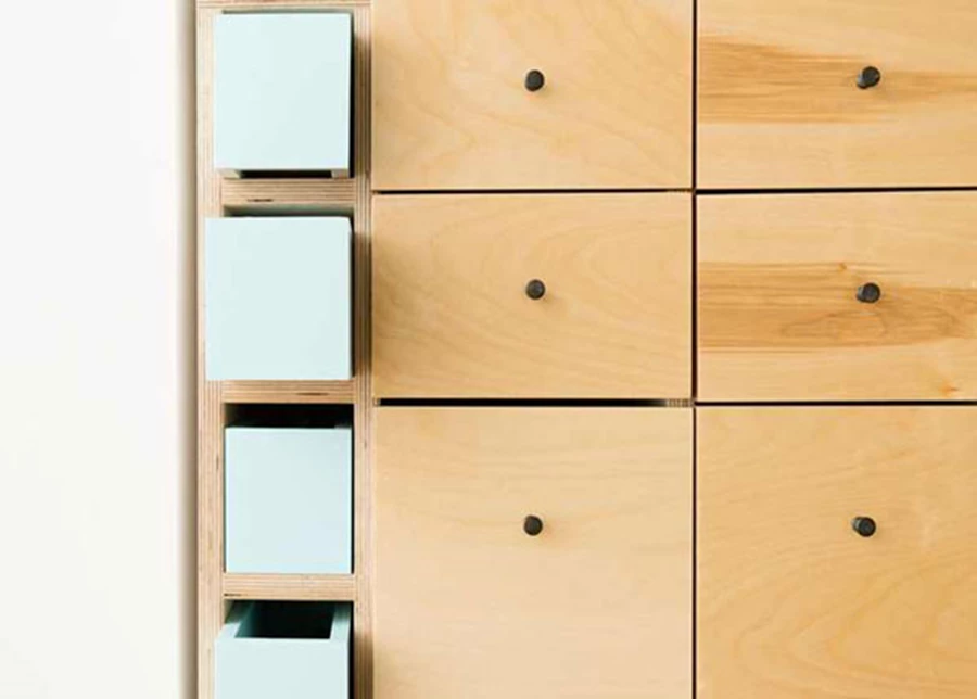 בכדי להעצים את תחושת ההתמצאות והסדר, חולק הסטודיו לקטגוריות שונות. כל קטגוריה, מיוצגת על ידי צבע מסוים, הנחשף רק כאשר נפתחת מגירה או כל יחידת אחסון אחרת. הארונות והיחידות עשויים עץ ליבנה, המשלים את הריצוף, אף הוא מאריחי ליבנה בהירים.