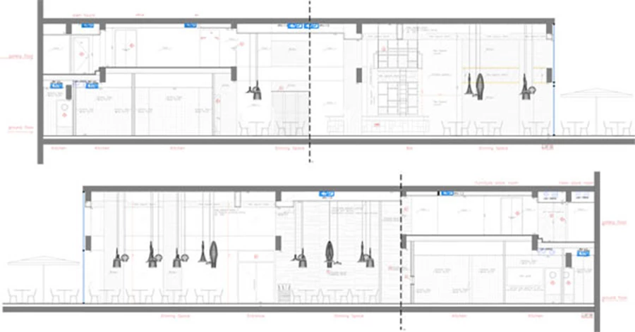 את החלל המתנשא לגובה כפול ומשתרע על שטח של 225 מ"ר פרש התכנון של הלפרין לשתי קומות בהן מוקמו הפונקציות הנדרשות: קומת הכניסה היא מרחב האירוח/סועדים שבשטחה נכלל גם המטבח כחלל נדיב מידות שנועד לספק מענה של שירות מהיר ואיכותי. הקומה העליונה תוכננה כקומת גלריה המרכזת בשטחה את אחסון המזון וכן את חלל השירותים, כאשר אגב כך ניתן לחוות את החלל גם מלמעלה במבט על.