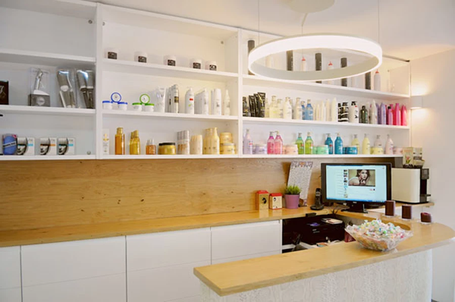 עמדות החפיפה הנוחות הם בצבעי שחור לבן, ולידן מדפים עם מגבות וארונות לאחסון בהישג יד של תכשירים ושאר הציוד של המספרה.