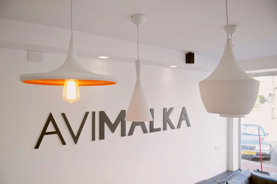 מעל הספה תלויים גופי תאורה לבנים, בעלי צורות גיאומטריות, עם תחתית מנחושת. על הקיר בעמדת ההמתנה תלויות בגאווה אותיות שם המותג.