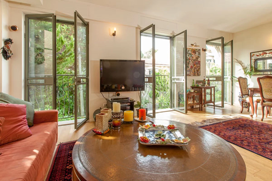 הקומה העיקרית של הבית משקיפה על צמרות העצים של הסמטה בה הוא נמצא. היה לנו חשוב לנצל את המראה היפה לטובת החלל המרכזי של הבית, ולכן בחרנו לפתוח בסלון ארבעה חלונות גדולים מפרופיל בלגי ברזל. חלונות אלו מגיעים עד לרצפה, ומעניקים תחושה של המצאות בין העצים.