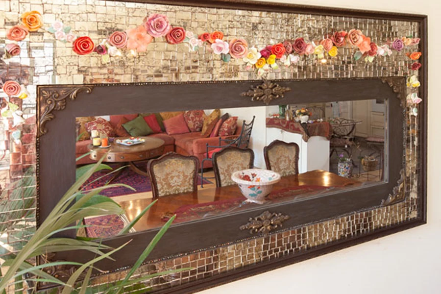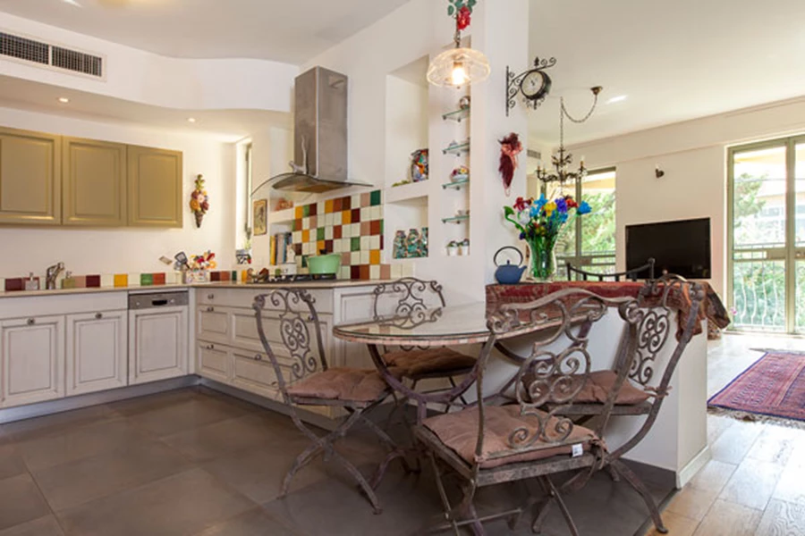 הריהוט העתיק של פינת האוכל, כולל השנדליר הגדול התלוי מעליה, משתלב היטב עם החלונות הגדולים ומראת המוזאיקה.