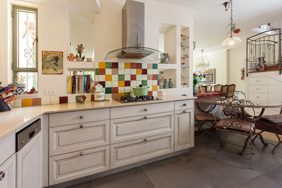 מכיוון שמדובר בדירה הנמצאת ב"רכבת" ארוכה, כמו רבות מדירות השיכון של פעם, יש לה בעצם רק שני כיווני אוויר. בחרנו למקם את המטבח במרכז הבית, ולפיכך יש לו רק חלון קטן החוצה, במרווח בין שתי דירות צמודות.