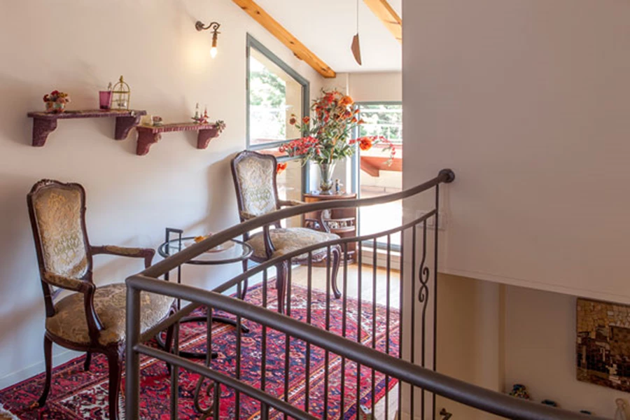 גג הרעפים הקיים הוגבה בכ-3 מטר, ועל ידי כך הרווחנו קומה נוספת מתחת לגג. התוצאה: בית מרווח בין שתי קומות, הנהנה מסביבה שקטה וירוקה. לבית שנוצר אגב כך היה פן נוסף, מעניין וייחודי, שנלקח בחשבון בעת התכנון: בעלת הבית היא אומנית מוזאיקה מוכשרת, כך שהמרחב תוכנן גם כרקע ליצירותיה המרהיבות, אשר אכן תורמות לאופיו הצבעוני והמיוחד.