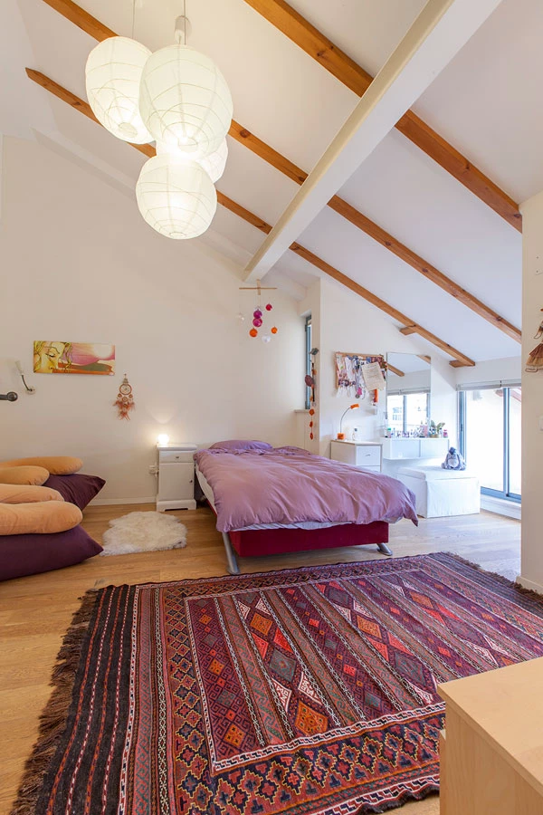 בקומה השנייה נמצאים גם שני חדרי השינה של הילדים, וכן פינת ישיבה קטנה. השארנו את חלל הגג פתוח, ואת קורות הגג גלויות, כך ששיפוע הגג יוצר אווירה מיוחדת,. בגג עצמו יצרנו מרפסת קטנה, המוסיפה הרבה לאיכות החיים בדירה.