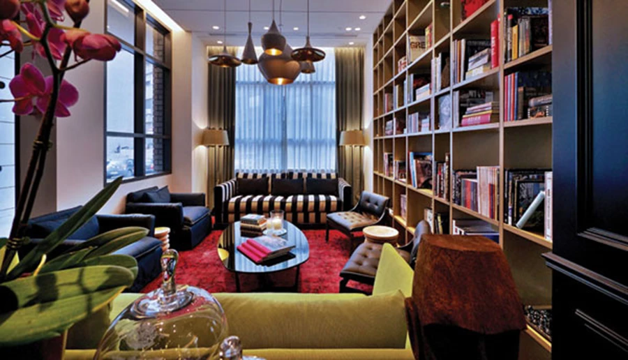אזור ההסבה בלובי עוצב כסלון ביתי לכל דבר עם שולחן קפה, כורסאות שמזמינות להתרווח בתוכן, שטיח בצבעוניות עזה ווילונות עוטפים, כאשר ספרייה מרשימה ה"מטפסת" לכל גובהו של החלל חוצצת בינו לבין אזור בית הקפה העוטה גוונים זהובים.