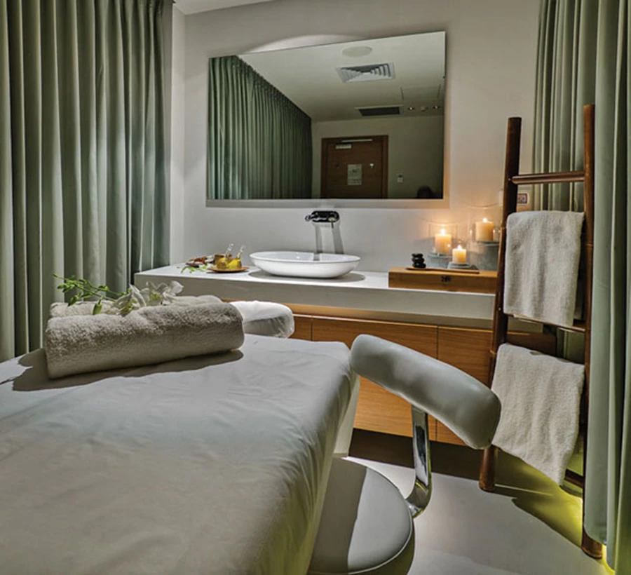 בקומת הספא: מארג עיצובי רגוע, נשען על גוונים בהירים עם נגיעות ירוקות המעניקות תחושה של טבע רענן.