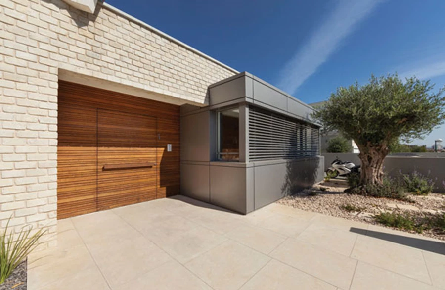 החזית הקדמית: מופע אטום ושילוב לא מצופה של גגות רעפים ולבני סיליקט המהדהדים ארומה כפרית עם קובייה מתועשת בחיפוי מתכתי (אלוקובונד) המייצגת מראה מודרני ועכשווי, חיפוי אבן: 'פרקטים'
