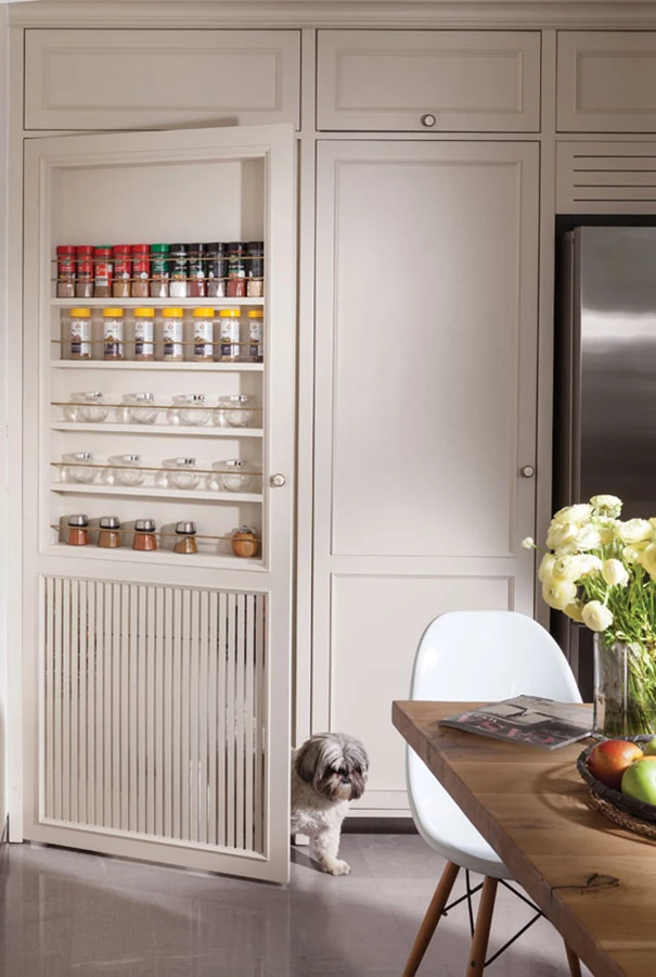 חמימות כפרית במטבח: חזיתות עץ בצביעה ידנית בגון שמנת עם פיגמנט אפרפר, ובמרכז החלל שולחן עץ גדול ומזמין. ביחידת הקיר: חזית "תמימה" שעל פני שטחה משתלבים מדפי תבלינים מתבררת כדלת לכל דבר המובילה למזווה גדול. נגרות מובח: עדי וארז נגרים.