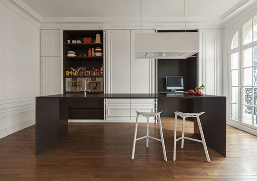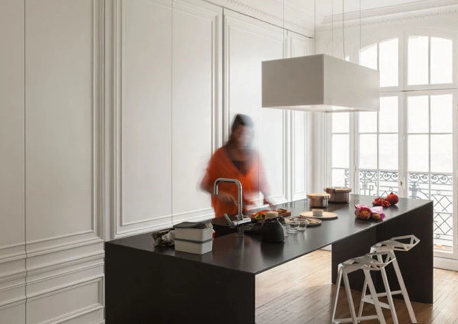 במקרה של הדירה הפריזאית הזו, העיצוב של לוחות הקיר הועתקו לשאר החלל, על מנת שהמטבח ייראה כהמשך טבעי של פינת האוכל וחדר האירוח.