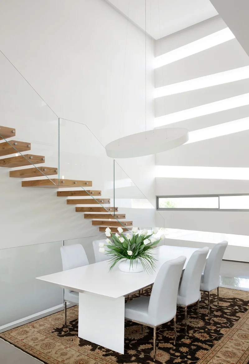 באזור החלל הגבוה סמוך לקיר הפסים של החזית הקדמית: פינת האוכל וגרם המדרגות הסמוך אליה. גרם המדרגות משלב קונסטרוקציית פלדה, מדרגות עץ זיזיות ומעקה שקוף הנמשך ותוחם גם מעבר גלריה בקומה העליונה. מעקות: "זכוכית שפירא"ברוח הניקיון הרעיוני של העיצוב התאורה מבוססת על ספוטים וגופים מוצנעים בתעלות תקרה, להוציא גוף תאורה דקורטיבי יחיד ששולב בפינת האוכל, כשגונו, הלבן כמובן, "מתיישר" עם גונם של השולחן והכיסאות. קיר הפסים מהווה מרכיב משמעותי בחלל הפנים, ונוכחותו מתעצמת עוד יותר נוכח שפת עיצובו החפה מפריטי נוי או דקורציות למיניהן, למעט שתי עבודות אמנות מרשימות שמספקות נקודות צבע- של האמנית מריה זלוצין ושל האמן דן שמיר.