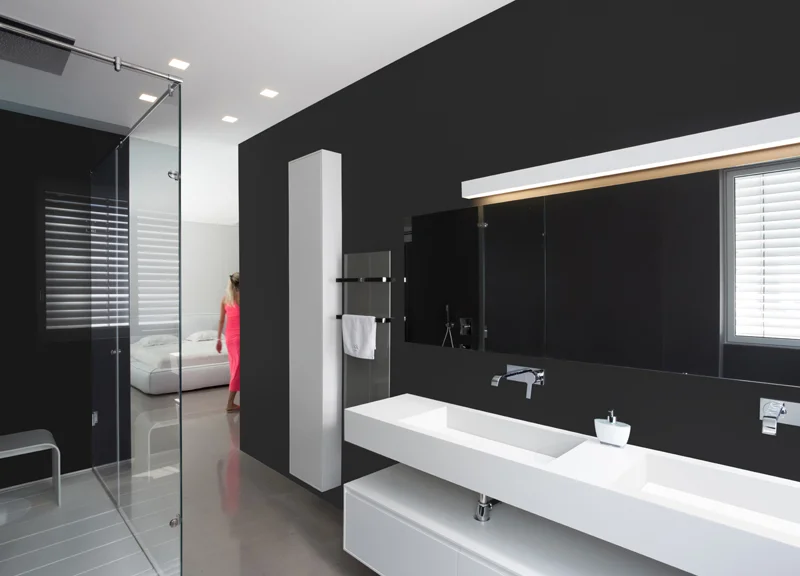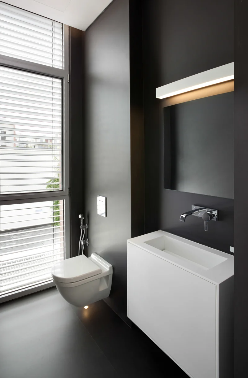 קפידה מינימליסטית. באזור הרחצה נוסף לגון הלבן והשולט גון שחור של אריחי חיפוי שחורים וגדולים, ומשטח הכיור עשוי קוריאן עם שילוב נגרות תואמת: משטח אופקי ארוך למדי שתחתיו, תוך שמירת מרווח ניתוק, משתלבת יחידת נגרות לבנה מרחפת. החומר הלבן והנקי משמש גם באגנית וכיסא ששולבו בחלל המקלחון, וחזות החלל ככלל, כמו בבית כולו, משדרת קפידה מינימליסטית.