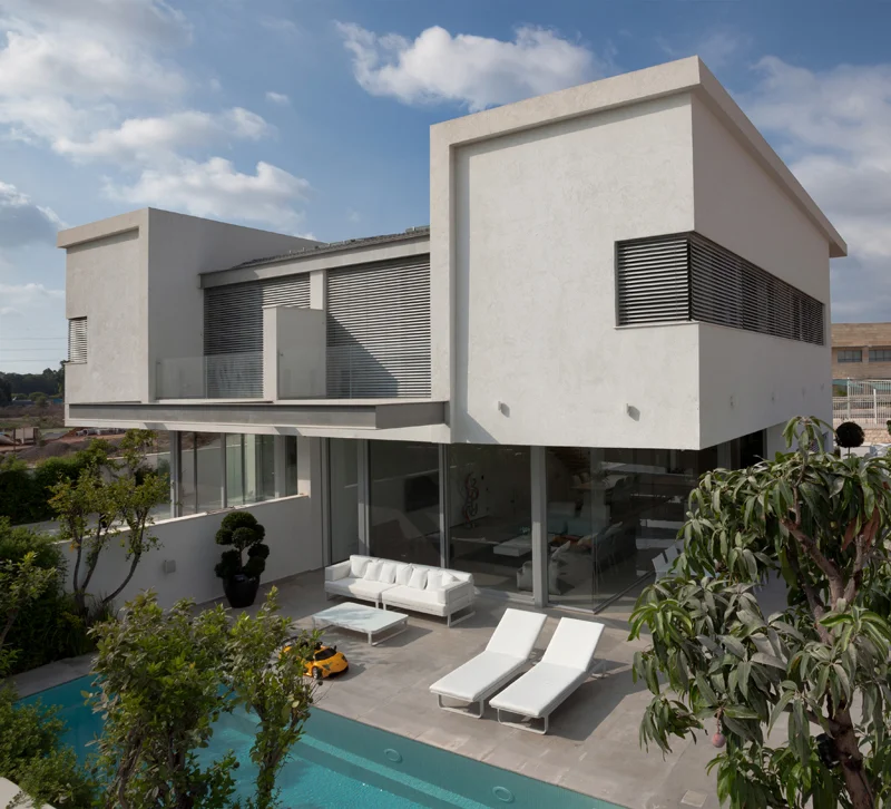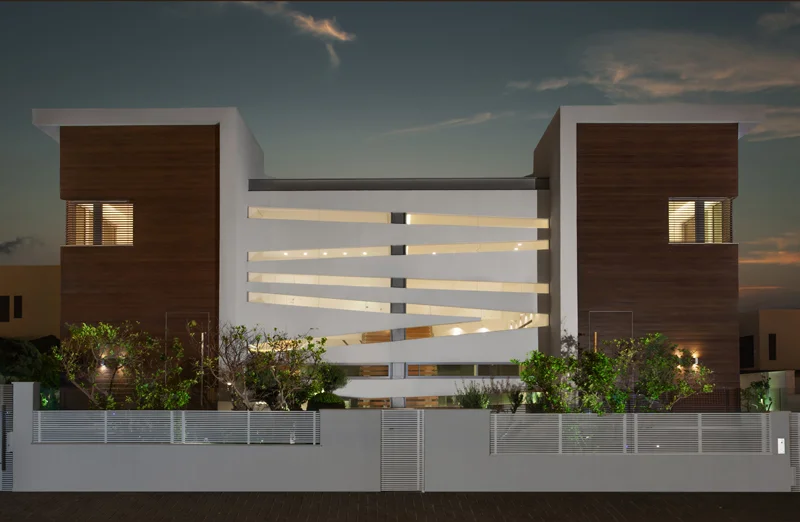 חזיתו של הבית השוכן בשכונת נחלת יהודה בראשל"צ, מתעתעת. למרות שמדובר במבנה דו משפחתי הכולל שתי יחידות דיור, המראה הנחשף לעין הוא של בית פרטי בודד: בין שתי קוביות מחופות סרגלי אלומיניום בגון עץ נמשכים פסי זכוכית אלכסוניים הקושרים אותן ומטשטשים את ההפרדה ביניהן.