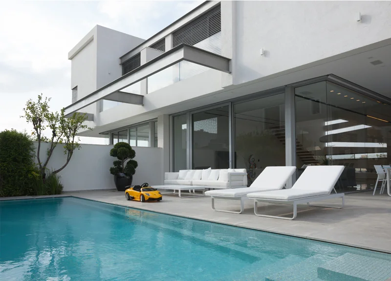 הויטרינות הותקנו בהדבקה, ללא כל עמודים, כשהן מייצרות חזית שקופה למשעי שחושפת את נוף הגן והבריכה ומדגישה קשר בין מרחבי הפנים והחוץ. לריצוף כלל אזורי הבית נבחרו אריחי שייגריי גדולים במיון מוקפד להשגת אחידות מקסימאלית, והנחתם שבוצעה ללא כל מרווחים משווה מראה של משטחי צבע רציפים. הקירות נצבעו בלבן, המככב גם במרבית האלמנטים בבית, במטבח שעוצב עם חזיתות צבע בתנור, ובפריטי הריהוט המשתלבים בחלל, עם מינון מדוד של גון אפור.