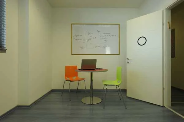 חדר הישיבות: שולחן פינג פונג מתפקד כשולחן ישיבות, ותקרה אקוסטית שחזותה שודרגה ע"י הוספת לוחות פח שנחתכו לפי מידה, צביעת חלקים לבנים קיימים בכסף, וצביעת גריד הריבועים כולו באדום.