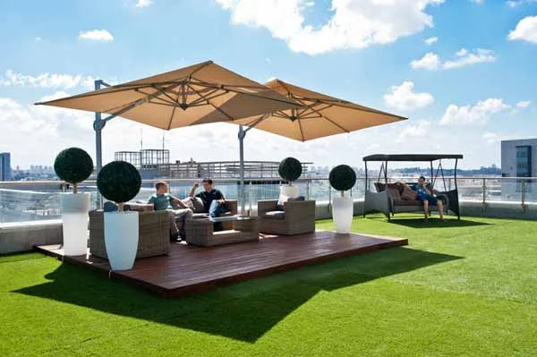 שטחה רחב הידיים שעמד מוזנח ללא תאורה, נחשף עתה כסוג של פארק המפתיע בתוך הנוף האורבאני שסובב אותו ומשקיף עליו ממרום גובהו. לריצוף נבחרו משטחי דשא סינטטי כרקע לעיצוב המדמה סביבת חוץ לכל דבר, בה משתלבים שולחנות פיקניק בנוסח שולחנות של קק"ל, דק ופרגולה, גזיבו, ריהוט גן, ואף מערכת קול איכותית מותאמת לתנאי חוץ "המרפסת מהווה 40% משטח המשרד כולו, וככזו היא משמעותית מאד ביצירת האווירה בו, וכך גם שילוב המוסיקה שנועד לנטרל את הרעש האורבאני ולהעניק תנאים אופטימאליים לזמני הפסקה רגועים" אומרים שחר, אבי ונדב על המרחב המלבב המהווה המשך ישיר של החלל, וכמוהו מתרגם את הרוח שהנחתה וטוותה את סיפור העיצוב כולו "מה שניסינו ליצור זו תחושה, שהאדם הנמצא בחלל יחוש את המקום עצמו ויהיה מחובר אליו. ירגיש שהוא נמצא במציאות ממשית ולא בסביבה וירטואלית, כמו זו שבה עוסקת החברה".