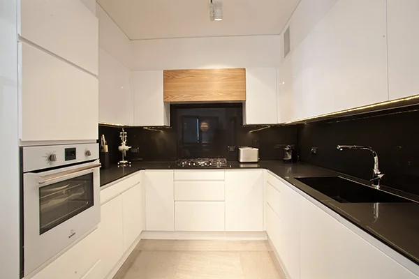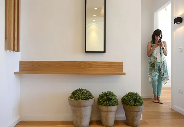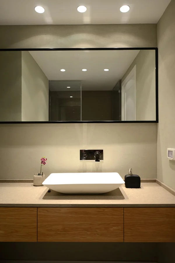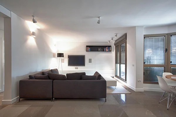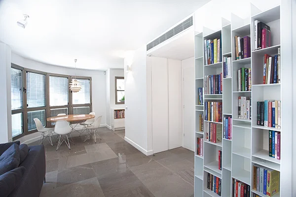 אזור הסלון והמטבח היו צריכים להיראות נקי ומסודר בכול עת, ולכן היה צורך בהרבה מקום סמוי לאחסון. הפתרון היה לתכנן "נגרות" על כול חזית קיר הסלון, כך שהטלוויזיה ומכשירי החשמל יכולים להיות מוסתרים וכך גם הספרים ואלמנטים נוספים. השינויים האלו יצרו מראה אלגנטי ומאוד נקי.