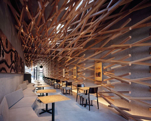 במשחק מחוכם בין הגלובאלי ללוקאלי האדריכל קנגו קומה מגשר בין מזרח למערב, בעיצוב סניף סטארבקס בעיר דֵזֵאיפוּ במחוז פוּקוּאוֹקַה, שביפן. מיקומו של הסניף בצומת המרכזית המובילה למקדש ההיסטורי דֵזֵאיפוּ טֵנמֵנגוּ, הכתיבה את הקונספט העיצובי של הפרוייקט: בית קפה מקרשים. למעלה מ- 2000 אלות עץ שהותקנו בחלל ומצטרפות לכמות כוללת ושוות ערך ל - 4.4 ק"מ,