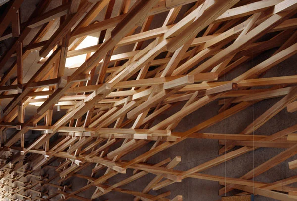 מייצרות מערכת אריגה ייחודית מקרשי עץ באורך 1.3 – 4 מ'. אלמנט עיצובי יחידי ודומיננטי זה, פונה בחוכמה פנימה והחוצה בנוכחות מרשימה המשתקפת למרחוק ומגדיר בצניעות את אופיו הייחודי והאמנותי של הסניף האמריקאי. סבכת הקרשים האלכסונית עוטפת את החלל בזרימה הרמונית ובקו מתאר ייחודי, אשר מגדיר מחדש את מוסכמות הסימטריה ומייצר מראה טבעי דמוי מערה. באופן זה המבנה מתכתב, משתלב ומתמזג בהתאמה עם ההיסטוריה האדריכלית והמסורתית של המקום והבנייה הטיפוסית והנמוכה של הסביבה.