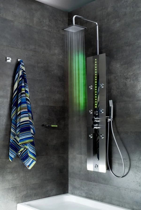 פינוק במקלחת עם קולקציית ברזים וראשי מקלחת עם חיבור לתאורת LED ושישה פתחי זרמים. עיצוב של מאסימילאינו
