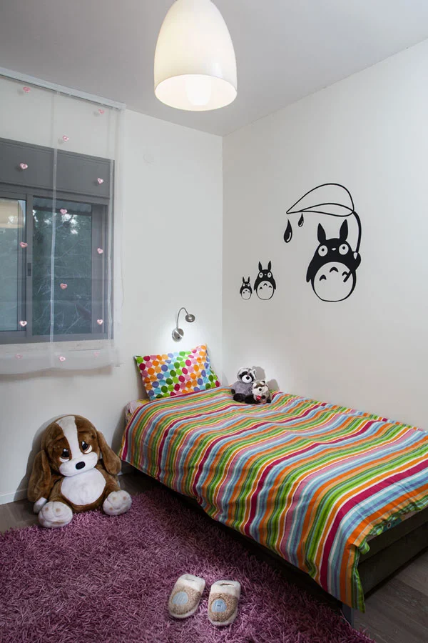 הזיקה לסגנון המזרח ולעיצוב יפני בפרט, באה לידי ביטוי בחדר השינה, בו עוצב הארון עם חזיתות בהשראתו, כאשר מדבקות קיר בדיגומים המזכירים אמנות יפנית משלימות את המראה. "מדבקות קיר הן אחת הדרכים להעשיר חזות של חלל או להוסיף לו עניין נוסף, וכאן הן אף היו אמצעי מצוין להדגיש את רוח הסגנון המבוקש" אומרת ונגרובסקי, אשר שילבה אותן גם בחדר הרחצה ובחדרה של הבת כטאצ' חינני.