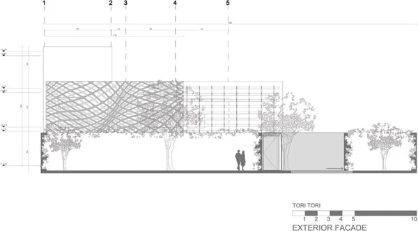 החזית יוצאת הדופן מדמה רשת, ונדמית כאילו בקעה מתוך האדמה כשהיא מטפסת מעלה בבניין, כמו מחקה את צמחי הקיסוס החובקים-סובבים את הקירות התומכים. מופעה הייחודי נרקם משתי שכבות "עצמאיות" (עם מרווח בין אחת לשנייה) עשויות מתכת בחיתוך CNCשהעניק להן חזות מחוררת אשר הושלמה בעבודת יד להשגת דיוק מרבי. "במשרדנו, אנחנו מקפידים מאד על תכנון אקספרימנטאלי באמצעים דיגיטאליים, כמו גם על איכויות הביצוע והבנייה. זוהי הסיבה שהתמקדנו באופן מיוחד בתרגום הגיאומטריה המורכבת לכדי שרטוטים פשוטים ומובנים שיהיו ניתנים לביצוע מקומי כאן במכסיקו סיטי" הניסיון הרחב שנצבר אצלנו במהלך השנים האחרונות חידד אצלנו את המודעות לגבי כוח העבודה המקומי ולגבי איכות התוצאה הסופית שביכולתנו לקבל, כמו גם את ההכרה שקשה יהיה למצוא כמותם במדינות אחרות" אומר ROJKIND כשהוא מתייחס לדיגום הרשת של החזית, העונה לממד הפתיחות של התכנון בהיותו מסנן את האור, הצל והמראות החודרים דרכו לחללי הפנים ומעשירים את האווירה בהם בשינויים מעודנים.