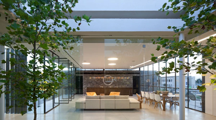 קדמת החלל מהווה מעין מבואה- ספק פנימית ספק חיצונית, המגלמת תפירה רכה ומושכלת של הערך השיווקי עם הערך האדריכלי "פרופר": בשטחה ממוקמת בריכת שיקוף נוספת המשמשת גם כבמה צפה להצבת מודל המגדל, וגוף תאורה מרשים המרחף מעל כעין ענן פיסולי ומשתקף במימיה מעצים את החוויה השואבת פנימה. את הקרום החוצץ בין אזור זה לאזור הפנים ה"רשמי" בחר קדם לייצר כמחיצה שתוכננה בפטרן גיאומטרי המורכב ממשולשי גבס, אשר אופן חיבורם זה לזה מאפשר קיום קשרי עין ישירים ומשתנים בין שני המרחבים, לצד עניין ויזואלי. הבחירה במוטיב המשולש אינה אקראית ואינה נובעת רק מרציונל אסתטי, כפי שמסביר קדם: "חבירתו לשיפוע הרמפה ולחתך המבנה מייצרת ממדים של רצף והמשכיות, וברובד הרעיוני הוא מייצג את ערכי הדינאמיות ו"ההובלה החווייתית" של התכנון". דיגום המשולשים אף הוטבע כטקסטורה על הקיר החיצוני בצדו המערבי של המבנה, שם מקנות לו קרני השמש המלטפות אותו אשליה של נפח ותלת ממד למרות הגון הלבן, הן של הטיח והן של הדיגום עצמו.