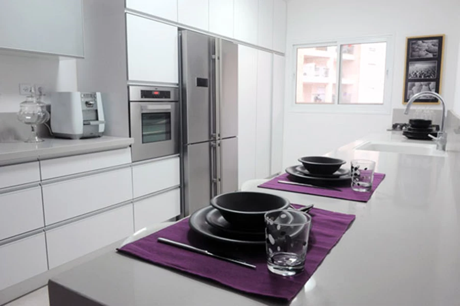 עיצוב המטבחשטיין: "בפרישתו המקורית של החלל המטבח היה מופרד מהסלון, ובנוסף הייתה בו פינת כביסה סגורה שהחשיכה והקטינה את התחושה עוד יותר, כך שהאתגר היה "לרווח" אותו וליצור חלל ציבורי אחיד, אוורירי ופתוח. לצורך זה הוסרו הקירות שחסמו בין שני האזורים, מיקומי הכיור, הכיריים והמקרר שונו, ומכונת הכביסה וכל האביזרים הלא אטרקטיביים כגון מגב, מטאטא כד' הוצנעו בתוך הארונות". מהלך זה אכן "פתח" את החלל, והפתיחות שנוצרה בו הודגשה באמצעות גוונים בהירים ואחידים- לבן בעיקר, עם נגיעות באפור.