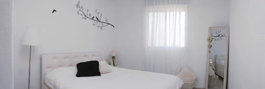 עיצוב חדר השינהחדר הרחצה בדירה עוצב אף בקווים נקיים, ונשלט ע"י גוון לבן המייצר אשליית מרחב ומדגיש את הניקיון הוויזואלי. חיפוי הקירות נצמד לסטנדרט הקבלני כשהוא מכסה את כל פני שטחו של הקיר באריחי קרמיקה לבנים, יחידת הכיור בוצעה בעבודת נגרות עם חיפוי פורמייקה, וסלסלאות קש נוחות לאחסון חפצים נדרשים משוות חן חמים ומסוגנן. כך, בתקציב מצומצם וללא מהפכות מבניות מסיביות מידי, התקבלה בדירה תחושה מרווחת ועכשווית, כאשר ההיצמדות לפלטת צבעים אחידה וניטראלית "פותחת" את האפשרות לגון את חללה המאוזן גם בהמשך, עם נגיעות עיצוב חדשות.