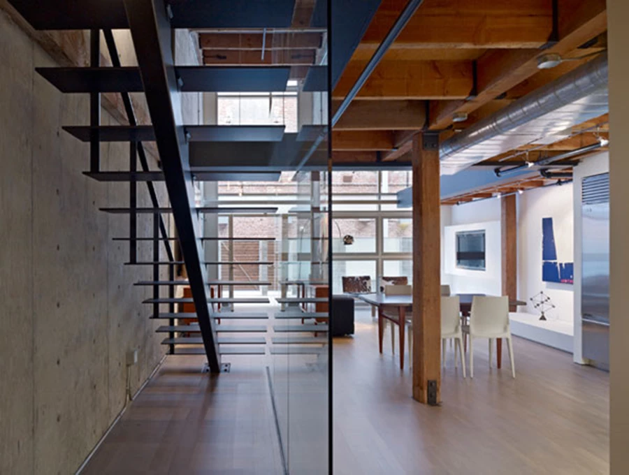 עיצוב החלל היה כרוך ברצף של מחוות הפשטה. כשהוט רכש את הדירה, גרם המדרגות המקורי המוביל אל חדר השינה ואל קומת גלריה היה עשוי מעץ אלון שהיה עבה מדי לחזון המעודן שלו ושל האדריכל אדמונדס. "הוא חסם את ההמשכיות של החלל", מסביר אדמונדס, אשר החליף את מדרכי העץ העבה במשטחי פלדה דקה חדה כתער, עד כדי לא מורגשת, המונחים על קורת הפלדה, ומלווים במעקה שקוף עשוי מלוחות זכוכית עבה.