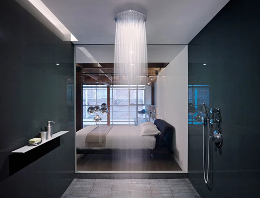 חלל הרחצה בעל דופן שקופה הפונה לחלל השינה.