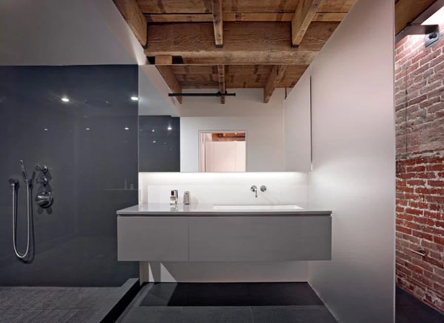 חלל גבוה בעל שני מפלסים.עיצוב הפנים עושה שילוב מעניין של חומרים: קיר הלבנים המקורי מהבנייה הישנה, פלדה שחורה, תקרת עץ, לוחות זכוכית, ורצפת עץ אלון- מגוון חומרי המייצר שילוב בין אדריכלות אמריקנית קלאסית ובין זו העכשווית במבט אל עידן חדש. יצירות האמנות בולטות באופן ישיר על הקירות, והן אלה המכתיבות את בחירת פריטי הריהוט שנרכשו אך ורק בחנויות עיצוב יוקרתיות ונושאות חותם של מעצבי על.