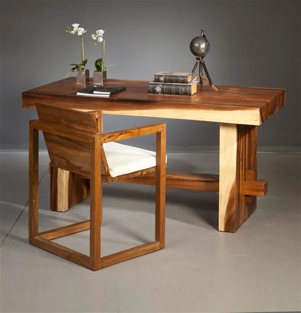 פינת עבודה הכוללת שולחן וכיסא עשויים מעץ גושני בחיתוך של קווים ישרים. 'גלריית 'Vastu'.מתוך 'כל בית צריך שולחן כתיבה'. גליון 125, יולי - אוגוסט 2012