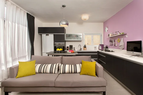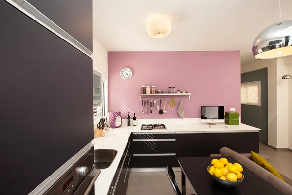 קיר סגול ונגיעות של ירוק ותכלת יוצקים עניין מפתיע בפלטת צבעים מאופקת של שחור, אפור ולבן. ניצול שטח מקסימאלי, ושילוב גלגלים בפריטי ריהוט שעוצבו ייעודית מאפשר גמישות וניוד קל. מטבע הדברים עיצוב חלל קטן חייב לנצל כל סנטימטר, והחשיבה אכן הופנתה לכיוון זה". בשלב הראשון של התהליך הוסרו מהדירה כל מחיצות הפנים, מרפסת שירות של הסלון סופחה לשטחה, ובחלוקה החדשה הפכה שקד את החלל על פניו, תוך התייחסות למיקומי הפתחים ולקולטן השירותים שהיה בבחינת נתון בלתי ניתן לשינוי (ראה תוכניות)- ואכן, היפוך מיקומי הפונקציות אפשר ליצור חלל מרכזי פתוח, אשר בתוך כך זכה גם ליהנות מפתחי החלונות המצויים בשטחו ותורמים לתחושה מאווררת. לריצוף החלל נבחרו אריחי גרניט פורצלן אפורים, מרבית קירותיו נצבעו בלבן, ואת הממד ה"מדליק" יוצק גון סגול שנבחר לצביעת קיר המטבח, אשר כקיר ראשי מהווה אלמנט מקשר בין שטחו והסלון. שקד: " שילוב צבע הוא דרך מצוינת להוסיף עניין ויזואלי לכל חלל, ועל אחת כמה וכמה בחלל כה קטן שאינו מאפשר לשלב אלמנטים כאלה או אחרים המייצרים עניין, ונדרש להסתפק בהכרחי בלבד ובהיבט הפונקציונאלי". אף תכנון התאורה נדרש להתייחס לממדיו הקטנים של החלל- לוודא שכל אחד מאזוריו יואר כראוי, אך ללא יצירת עומס של גופים רבים מידי.
