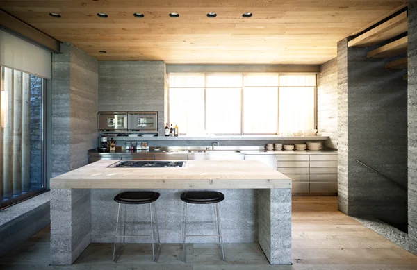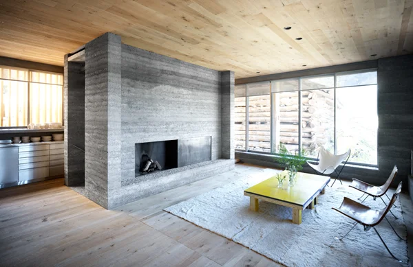 קיר בטון חוצץ בין הסלון והמטבח: צדו האחד משמש דופן של חלל המדרגות, ובעברו השני הוא מכיל בתוכו אח מרכזי הממוקם באופן זהה בכל קומות הבית.