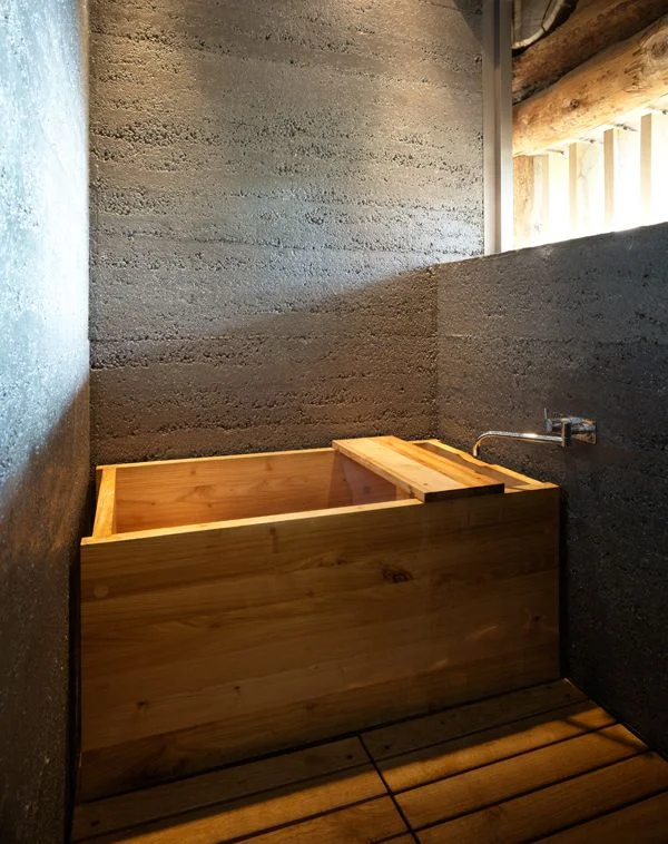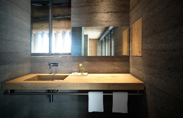 חדר הרחצה: ארון השירות נטמע בתוספת הבטון. משטח הכיור עשוי מעץ אלון.