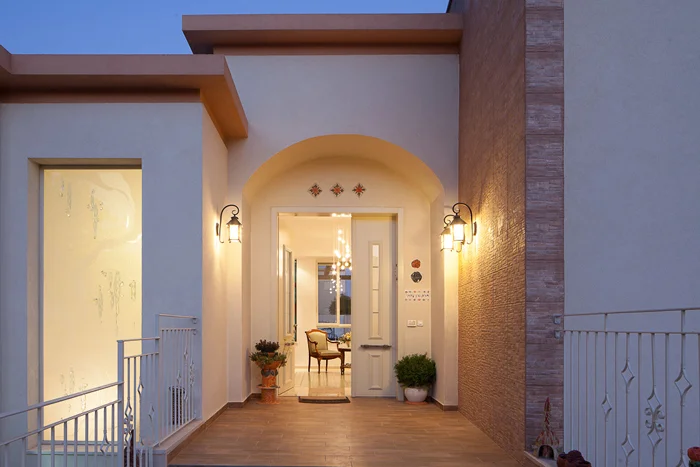 אזור הכניסה, מבט מבחוץ: "מאפשר מבט ישיר אל החצר הפנימית, מקום מפגש אור השמש ממזרח וממערב" "האני מאמין שלי כאדריכלית" אומרת טל, "גורס כי יצירת מרחב מחייה לאדם/משפחה כרוך בתהליך גילוי של רובדי תוכן שונים המרכיבים את ה"סיפור", הן של הדיירים, והן של המקום בו ייבנה ביתם. המטרה היא להגדיר במדויק למה באמת זקוק האדם במרחב הפיזי שלו, מהו הערך המוסף שיאפשר התאמה מלאה בין החלל ובין סיפורו האישי ומה יגרום לו להרגיש "הבית הזה הוא שלי ומתאים לי במדויק". מנקודת מוצא זו, ובהתייחס לפרוגראמה הלא שגרתית ולעולם התוכן הרבגוני של הדיירים, רקמה טל את הקונספט התכנוני כקונספט של "גם וגם"- בית שיכיל את כלל המרכיבים הכה שונים באופיים, ובה בעת יאחד אותם לכדי מרחב הרמוני אחד. כך, הבית משתרע אמנם על שטח נרחב למדי של 300 מ"ר, אך חלליו שתוכננו כחללים אינטימיים ואישיים משמרים קנה מידה ידידותי ומזמין.