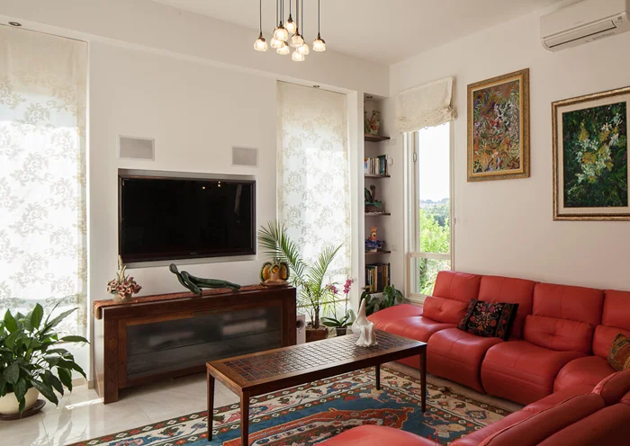 טל: "מענה מדויק לכל צורך אחסון ותכנון מוקפד של מיקומים היו חשובים מאד בחלל שהינו כה גדוש. באורח זה יצרנו מארג מסודר, אשר למרות הגודש הרב משמר את השקט והשלווה המבוקשים, ובאותה נשימה מדגיש את הערך התוכני הייחודי של כל אלמנט המשתלב בו". כך, למשל, בפינת הישיבה בסלון מודגשת נוכחותן הצבעונית של ספות אדומות, ובפינת האוכל המרשימה ניצבים שולחן עתיק מתקופת הרנסאנס (יובא מדנמרק) שעליו הותקן משטח זכוכית מחוסמת ושנים עשר כיסאות מסוף המאה ה-19 ששוחזרו ורופדו מחדש. המטבח המאופיין בחזות כפרית עוצב מעץ מלא, ומשטח עבודה גדול, עשוי שיש גרניט איטלקי בהזמנה מיוחדת, מאפשר לשני בני הזוג ליהנות מבישול בצוותא. המזווה הצמוד אליו משופע בחללי אחסון, ופתח יציאה/כניסה המקשר אותו היישר לאזור החניה מעניק נוחות רבה כששבים הביתה מקניות, עמוסי סלים.